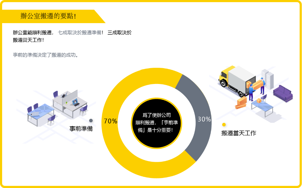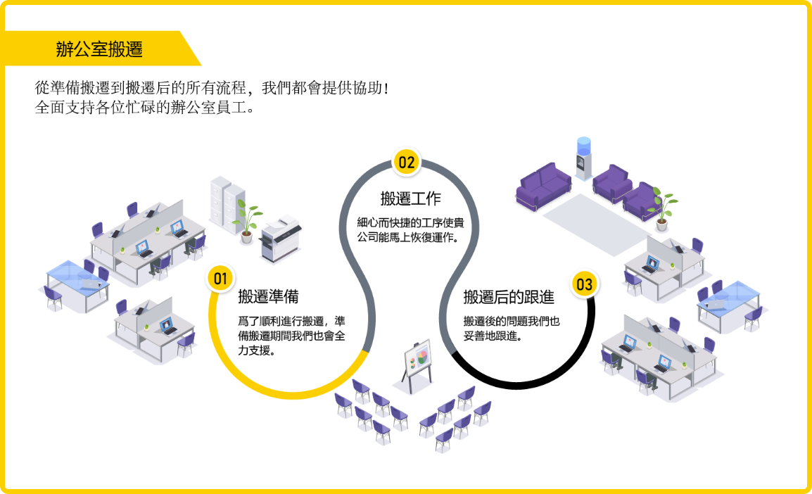 雅瑪多為您提供日式的優質搬遷服務,助您解決各種與辦公室搬遷相關的煩惱和問題, 縮短您在搬遷時所花的時間, 讓您無後顧之憂, 輕鬆地遷移到新的辦公室。